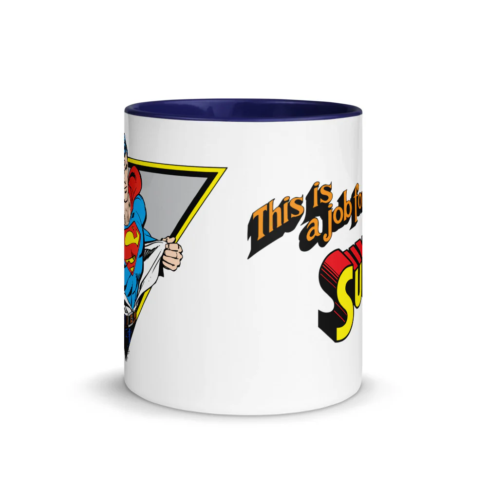 A simple statement. 11 oz. ceramic two-tone mug with vintage image of the Man of Steel on one side, “This is a job for… Superman” on reverse.